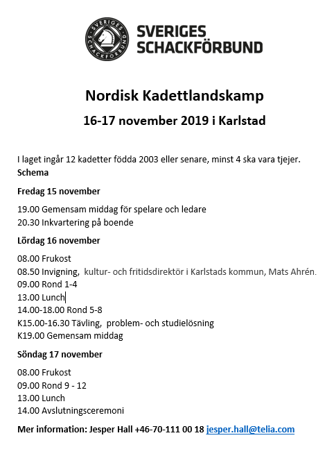 Det blir en Kadettlandskamp mellan Sverige och Norge i Karlstad 16-17/nov.
