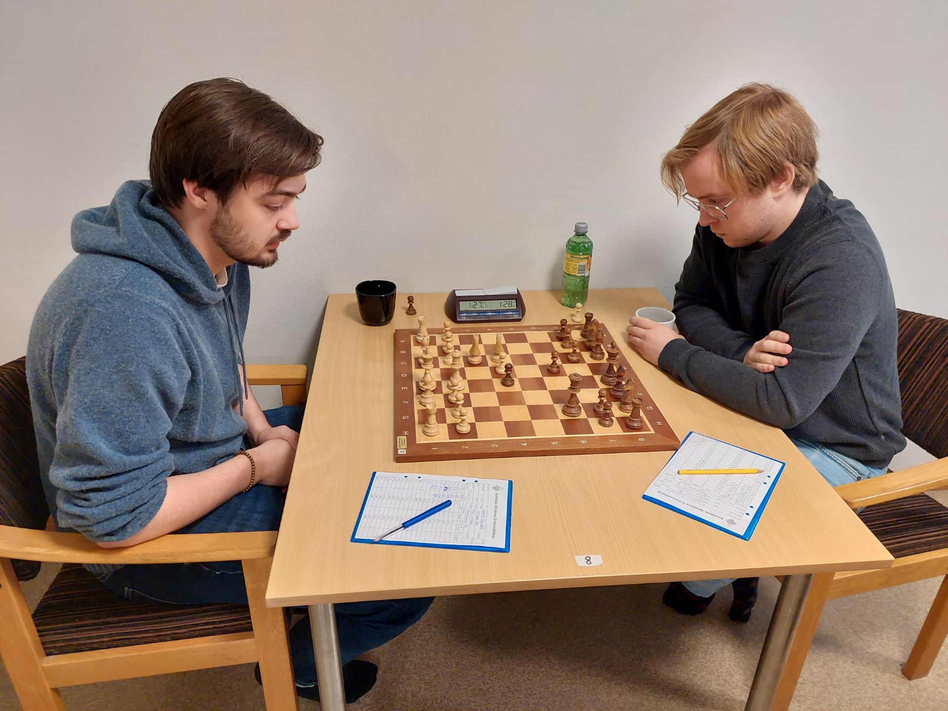 På åttan spelade Gabriel Fagerslett vit i Lettisk Gambit. Detta är faktiskt premiär för Gabriel i lagschacket. Som brukligt brukar en sådan öppning leda till komplicerat spel. Han fick övertaget men remi blev det då ett olikfärgat löparslutspel tog vid.