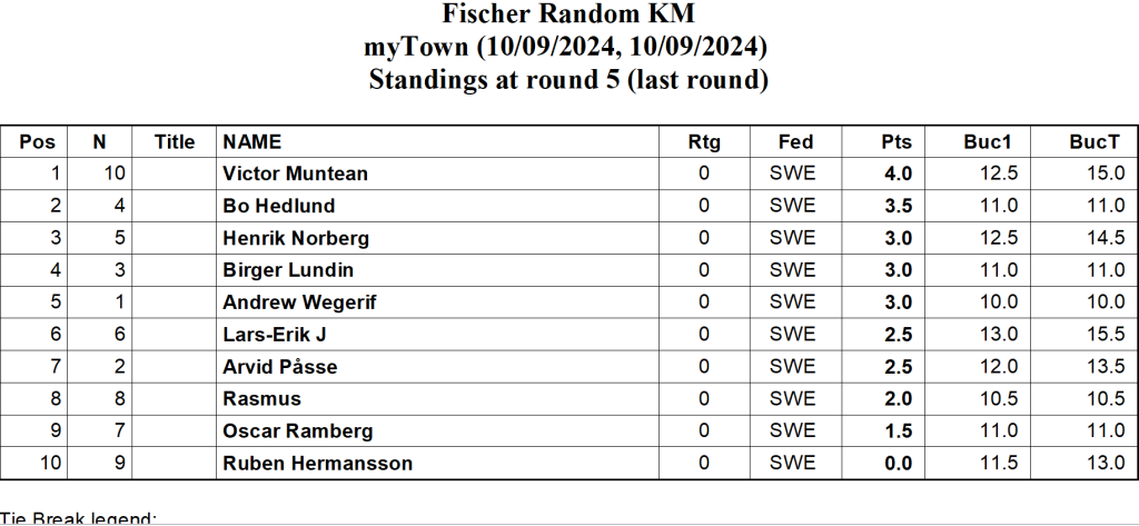 Klubbens första KM i detta format spelades under tisdagen. Tidskontrollen var 15 min. Totalt var det 5 ronder, där en ny utgångsställning lottades varje rond. Några behövde lämna turneringen lite tidigare, bla Victor som vann turneringen ändå, efter seger i de första 4 ronderna.