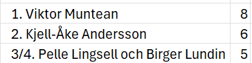 21.45 var det så dags för genomgång av lösningar, dator aktiverades och bildskärm kopplades på. Undertecknad genomförde knappnålstestet. Knappnålen kunde tydligt, på mjukt underlag, höras falla. Lösningarna genomgicks under konsekutiv ordning. När denna procedur gått till ända så kunde vinnaren få sin lagerkrans. Så här blev det.
