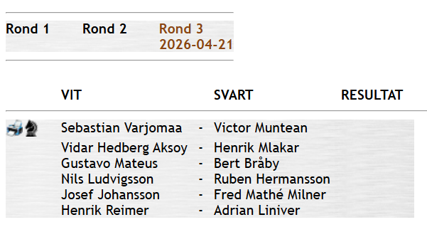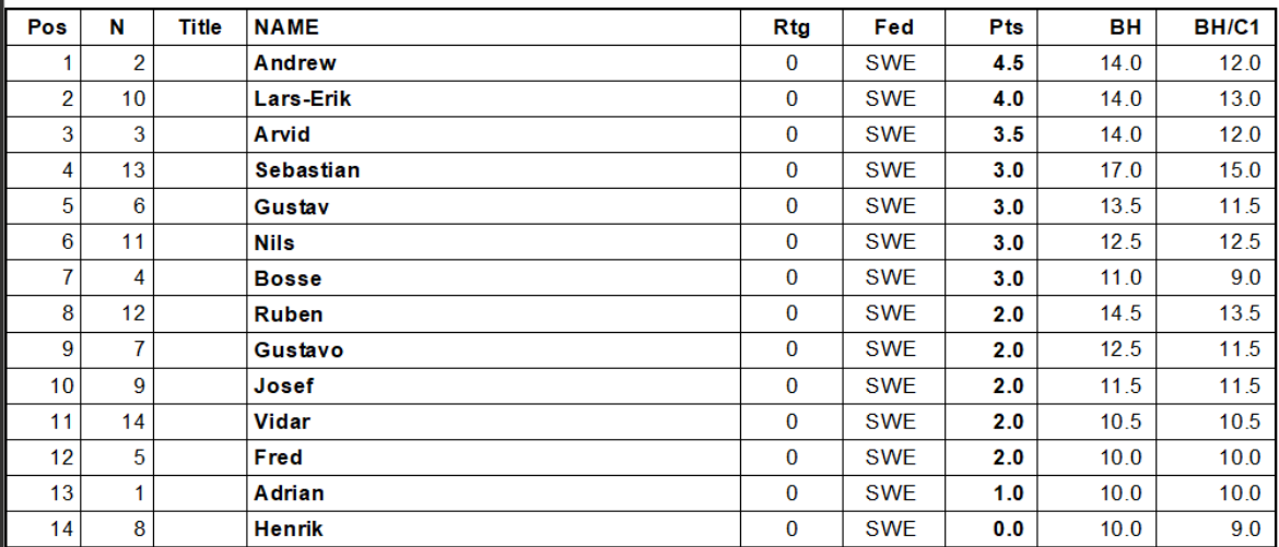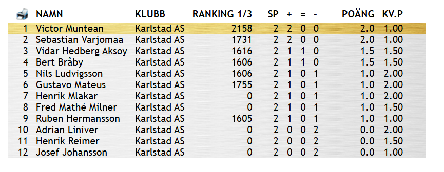 Wilhelm från Molkoms folkhögskola vann turneringen. Han har tidigare varit hos oss och spelat. Normalt måste man ju vara med i klubben för att koras till mästare. Efter turneringens slut så tyckte Wilhelm det var absolut dags att bli medlem. Det gjorde att de närvarande utan vidare godkände honom som klubbmästare.