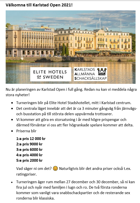 Karlstads Allmänna Schacksällskaps styrelse har därför tvingats fatta beslutet att ställa in Karlstad Open 2021.
